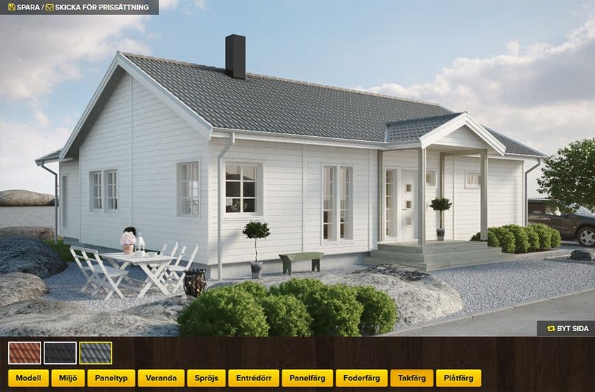 Nu kan du välja design för din nya SmålandsVilla på webben. Med vår nya Exteriörväljare väljer du paneltyp, panelfärg, veranda, spröjs, entrédörr, foderfärg, takfärg etc.