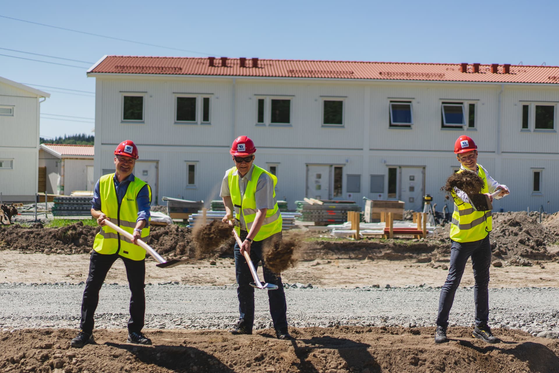 Under måndagen fanns OBOS regionchef Per Lönner samt projektutvecklare Per Sutter på plats på Hälltorps gård norra för att tillsammans med Trollhättan Stads kommunalråd och kommunstyrelseordförande Paul Åkerlund (S) ta det första spadtaget i Brf Mustmästaren.