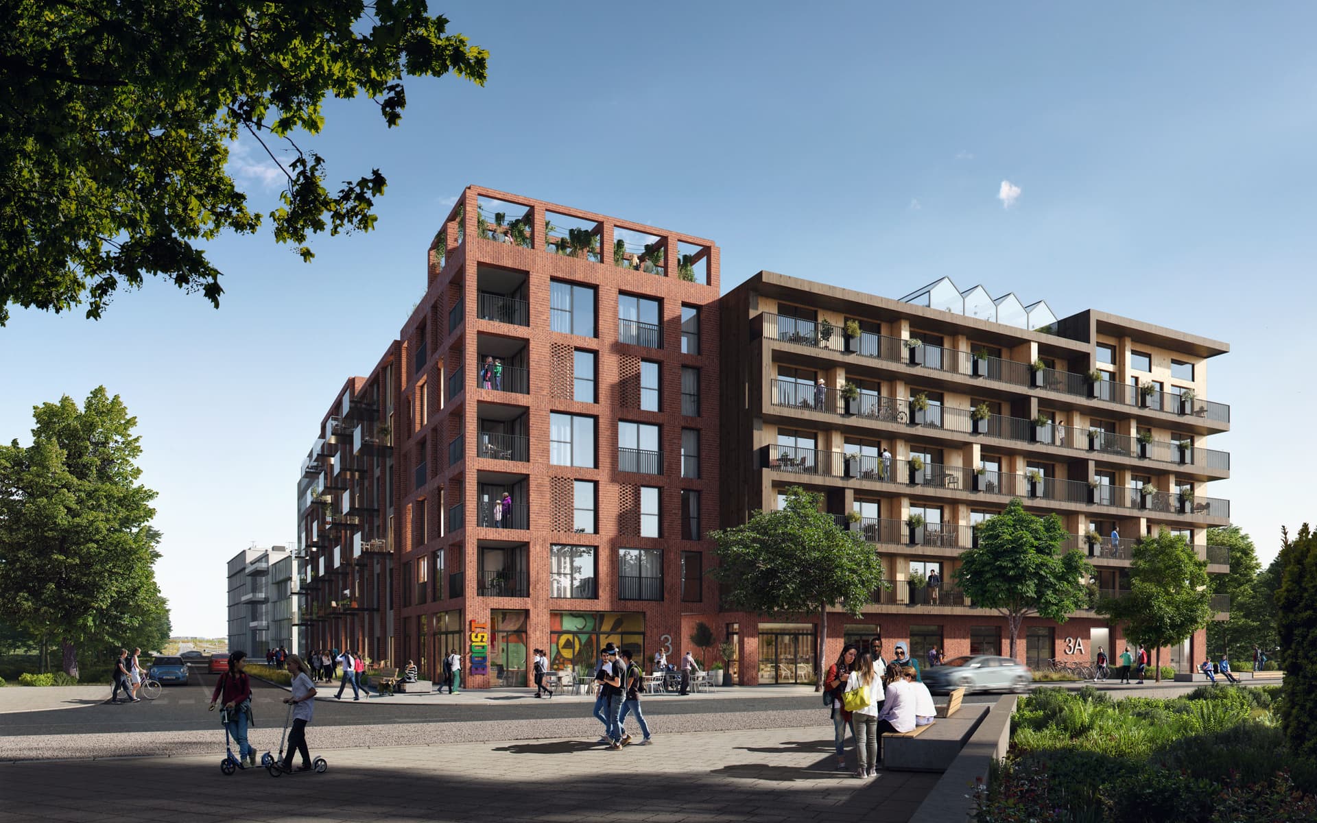 Genom bland annat solceller på taken erbjuds en energigemenskap där produktion, lagring och delning av energi mellan fastigheterna är möjlig. Exteriörerna i förslaget kommer präglas av tegel och trä med gemensam trädgård och gårdsskog på innergården som erbjuder sociala ytor. Aktivitetslokaler och förskola kommer ligga i nära anslutning till fastigheterna. Lägenheterna varierar från mellan ett till fyra rum och kommer kännetecknas av yteffektiva lösningar som passar hushållens olika storlekar och behov.