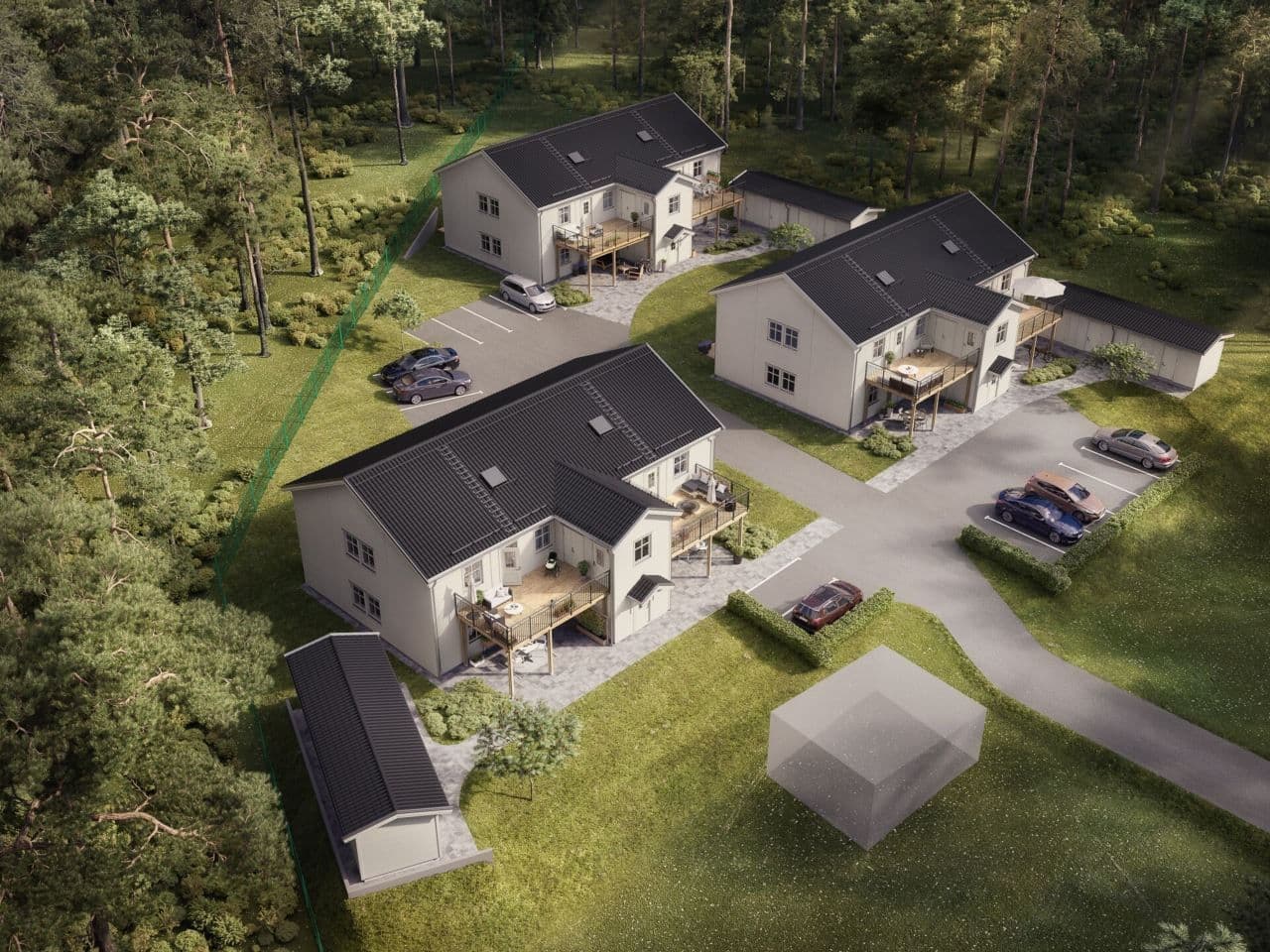 Utvändigt har varje lägenhet en egen parkering på bekvämt avstånd från den egna entrén, samt isolerat förråd i tre separata förrådslängor på området.