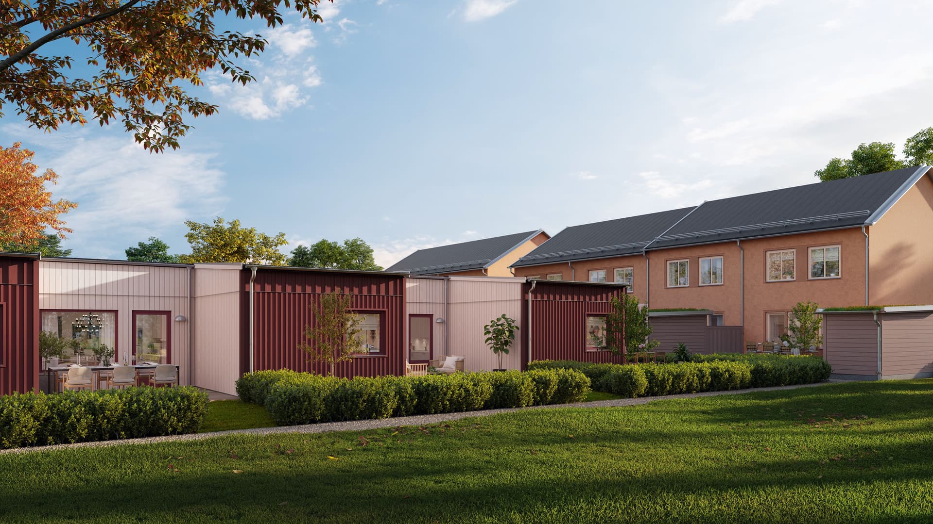 I den första etappen erbjuder OBOS 15 radhus i två varianter – ett tvåplanshus på 105 kvadratmeter och ett enplanshus på 95 kvadratmeter. Husen har flexibel planlösning med möjlighet att välja två, tre eller fyra sovrum. Samtliga har en egen trädgård med tydlig avgränsning till de närliggande tomterna.