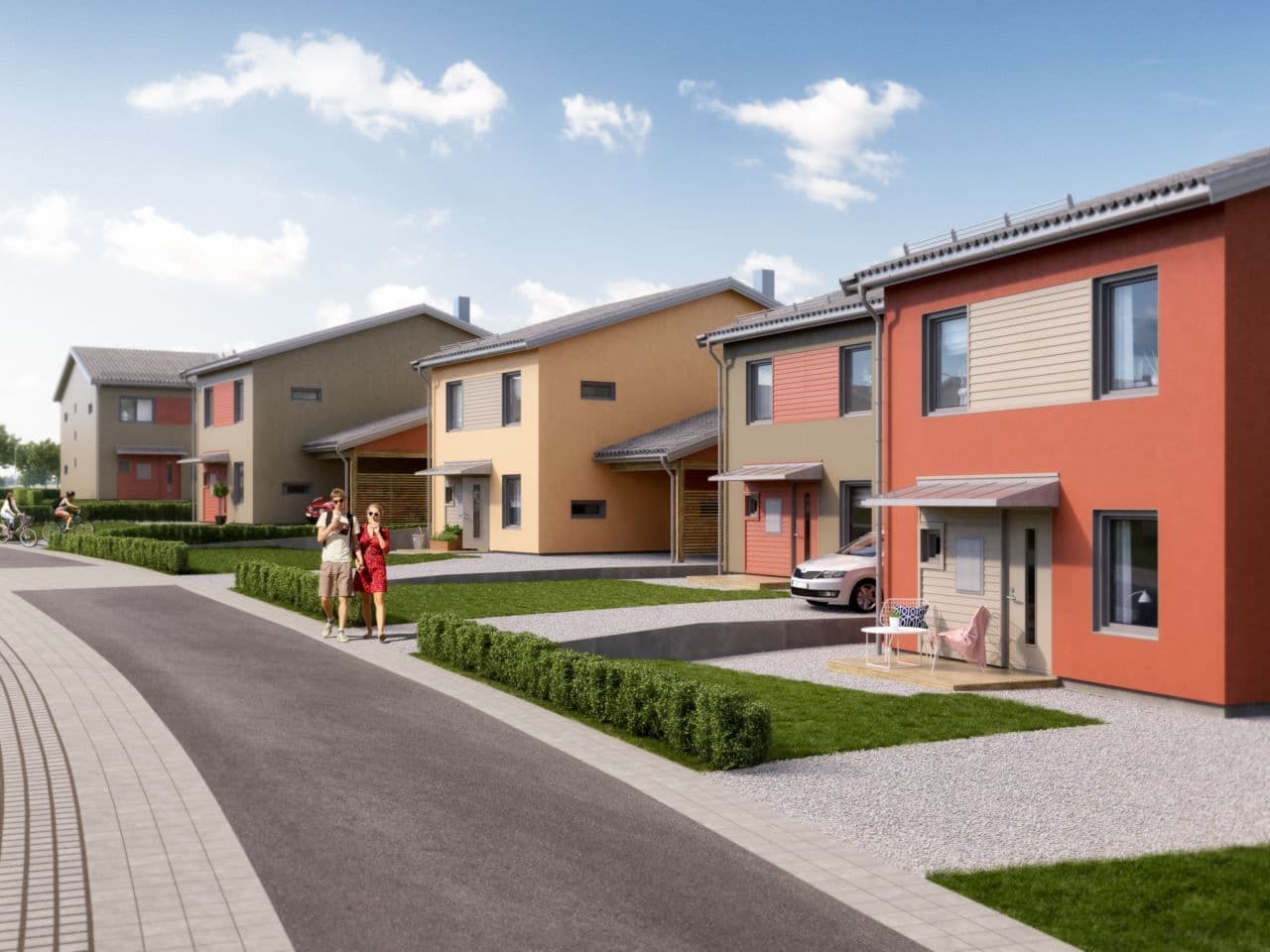 - Det är riktigt moderna hus i hela sin framtoning, säger projektutvecklare Emma Stålhammar. Fasaden är i puts och trä och färgsättningen har vi valt att göra ganska glad för att ge en levande och varm känsla till kvarteret.