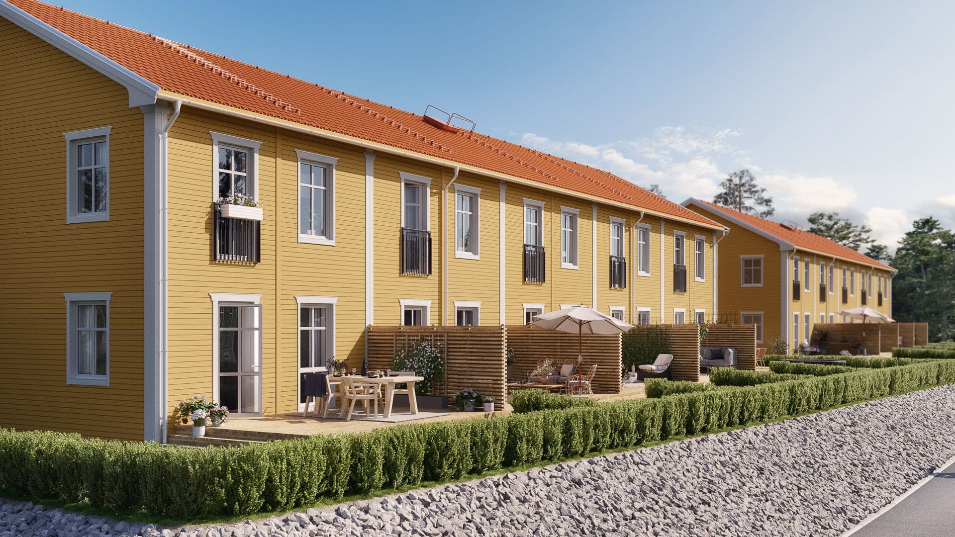 - Här bygger vi i trä med klassisk färgsättning, gult med vita knutar och en välkomnande röd dörr som kronan på verket. Vi satsar också på att få till en trivsam känsla mellan husen. Jag ser framför mig ett riktigt trevligt kvarter utan genomfartstrafik, där den lilla kvartersgatan snarare blir en plats där barnen spelar landhockey eller kanske lär sig cykla, fortsätter Henrik Wirén.