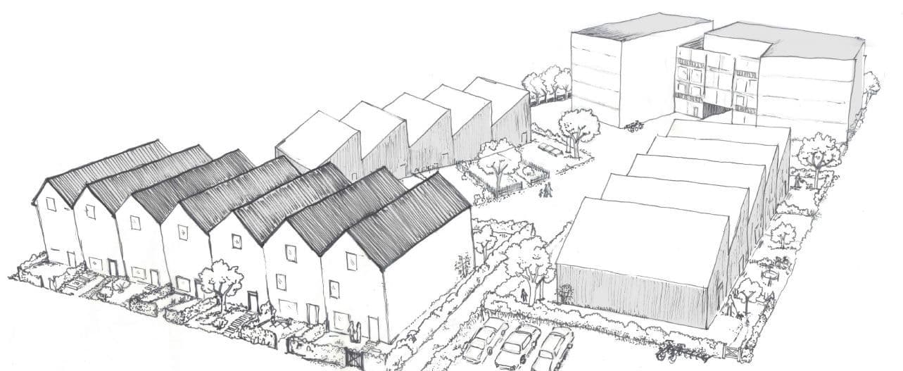 I OBOS anbud hade man tillsammans med arkitektbyrån Krook & Tjäder tagit fram ett förslag på 15-20 radhus och 45-50 lägenheter i flerbostadshus, med hållbar tillverkning och den omgivande miljön i åtanke.