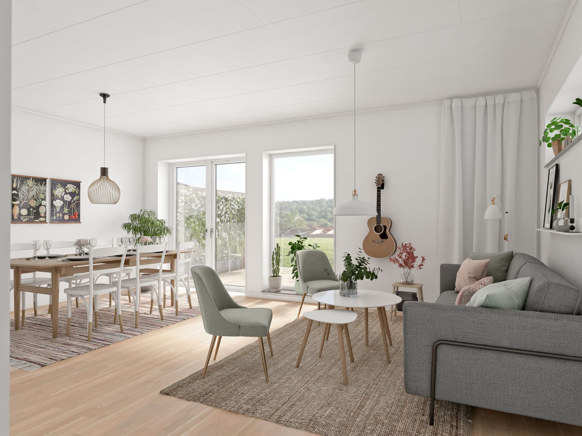 Marklägenheterna som OBOS bygger i bostadsrättsföreningen byggs som parhus i ett plan med putsfasad, och bostäderna får en boarea på cirka 88 kvm. Christina berättar att det är flexibla hus, med öppen planlösning, generöst ljusinsläpp, modernt och smakfullt inredda och med uteplats i söderläge.