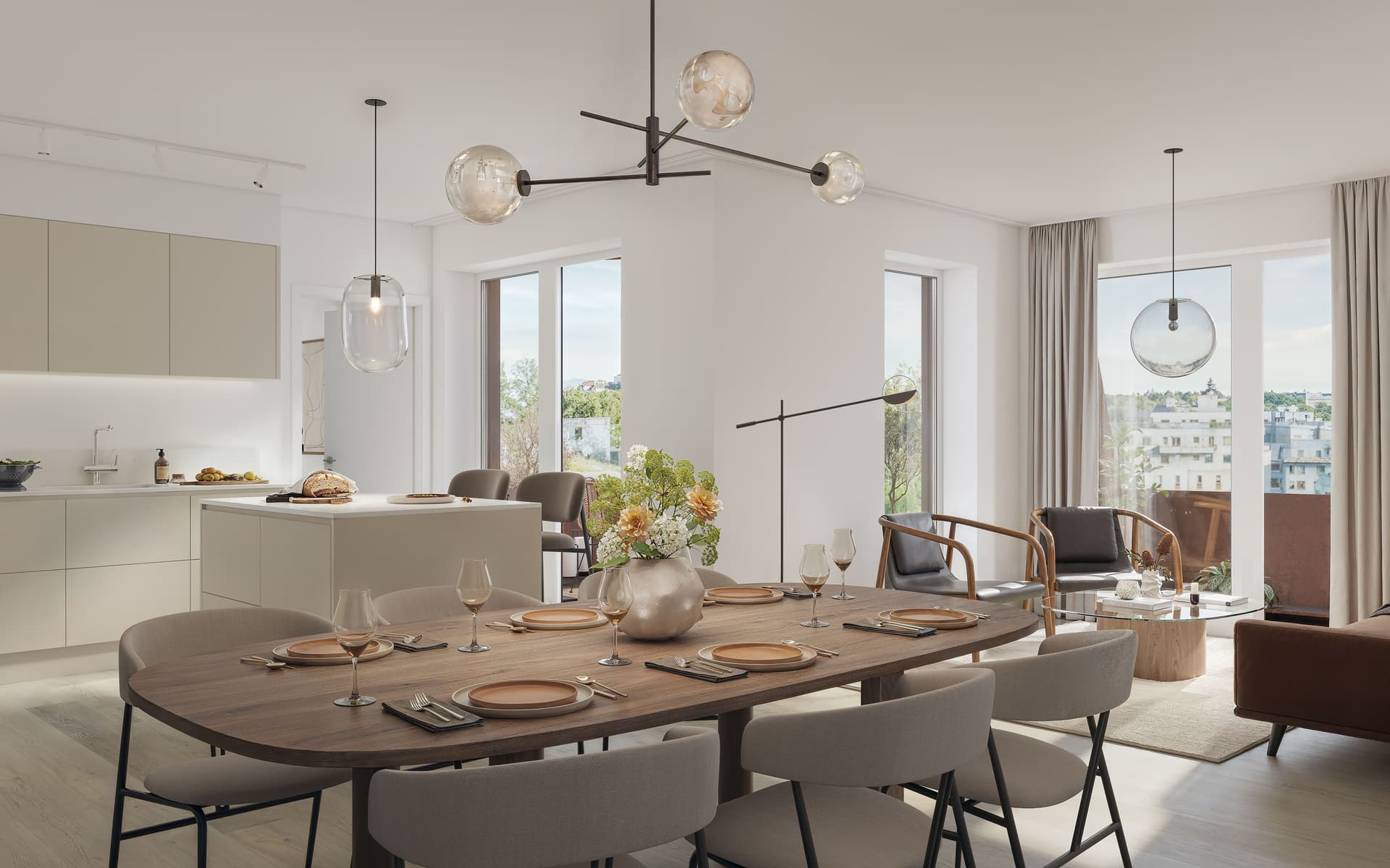 Interiörerna, framtagna av Yellon, präglas av en sober och tidlös materialitet med enstavsparkett i ek, omsorgsfulla detaljer och golvvärme i hela bostaden.