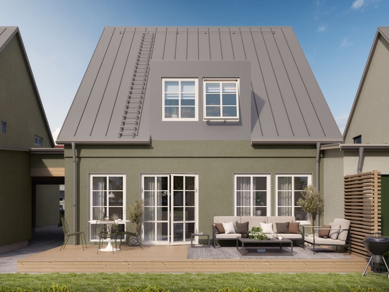 - Här blir det charmiga 1,5-plansvillor med gatuhuskaraktär, säger projektutvecklare Emma Stålhammar. Utvändigt får de putsfasad och plåttak, och en lite spännande fönstersättning. Inspiration till husen har vi hämtat från radhuslängorna i vårt populära och nu slutsålda projekt Brf Klagshamnsterrassen.